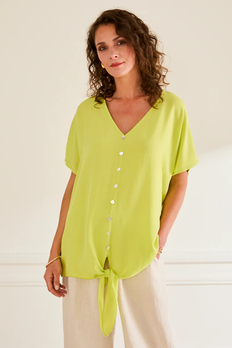 Envie d’un style un peu plus travaillé mais sans effort ? Optez pour une chemise en coton légère, nouée sur le devant. C’est un petit détail qui change tout, en rappelant la silhouette de la jupe et en donnant un côté bohème super charmant. Les couleurs neutres comme le beige, le bleu ciel ou même un imprimé léger s’accordent à merveille. Aux pieds, des sandales en cuir ou des espadrilles complètent l’allure.